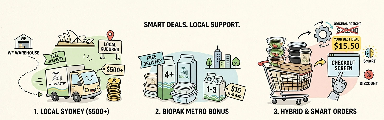 We’ve negotiated deep discounts with carriers like Direct Freight Express to keep our base rates low for regional and interstate customers. Whether you're buying a single carton of coffee cups or a full pallet of BioPak packaging, our system is constantly working to find the most efficient path to your door.