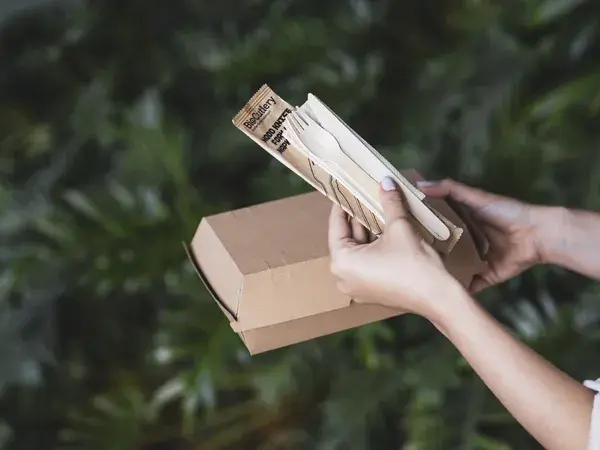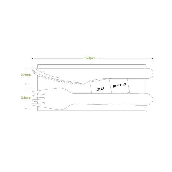 BioPak wooden cutlery set is an eco-friendly solution for stylish and sustainable dining. Made from premium quality FSC certified Birchwood, this utensil set is both durable and sturdy. FSC (Forest Stewardship Council) is the industry benchmark for sustainably managed wood and wood products. The set includes a wooden fork and knife, both ergonomically designed for a comfortable grip and smooth, effortless cutting. The accompanying kraft (brown) napkin is wrapped in a kraft paper sleeve with an ultra cool print, while the salt and pepper sachets ensure that every meal is seasoned to perfection. Meal packs / cutlery sets are a great idea for takeaway meals so that you can control how much cutlery / how many napkins are being taken by your customers. Additionally, these cutlery sets offer a high quality look and feel that is perfect to accompany the rest of your BioPak bio packaging.