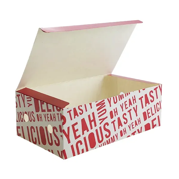 Don't let inadequate packaging slow down your operation or compromise your food quality. Our Large "Tasty Food" Cardboard Snack Box is a robust, ready-to-use solution that elevates your service and delights your customers. Give your best dishes the durable, attractive presentation they deserve.