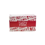 Elevate your takeaway and delivery presentation with this eye-catching Small Cardboard Snack Box featuring our vibrant, high impact "Tasty Food" design. This is more than just a box; it's an instant branding boost and a promise of deliciousness. The crisp white background, boldly overlaid with red, appetising words like "YUMMY," "TASTY," "DELICIOUS," and "OH YEAH," grab attention and excite customers before they even take their first bite. Designed for small servings, this box is the perfect blend of style, convenience, and eco-consciousness for any modern food business. Make every snack feel like a celebration!